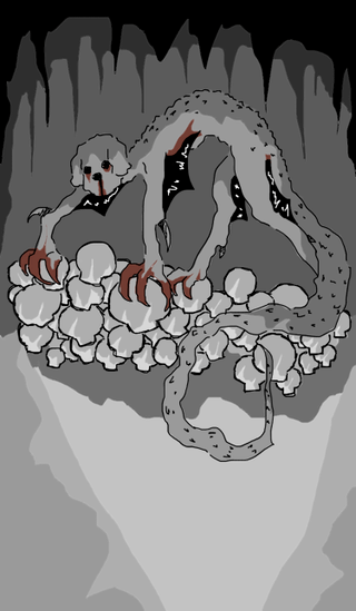 A dragon like dog born from humanity’s cruelty, wings forced upon stretched limbs, whining and wh...