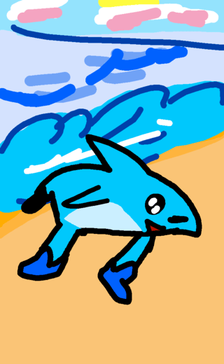 A shark with shoes dancing on the beach