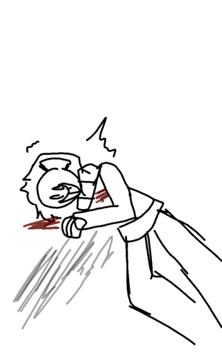 *she gets up, holding her chest. She holds onto a table for support and looks at her creation. He...