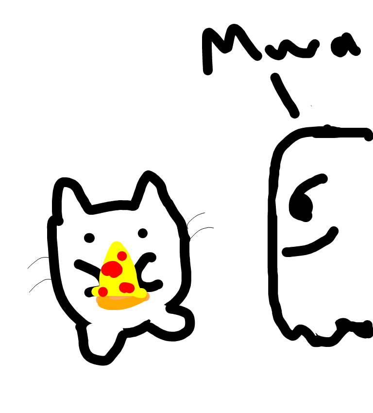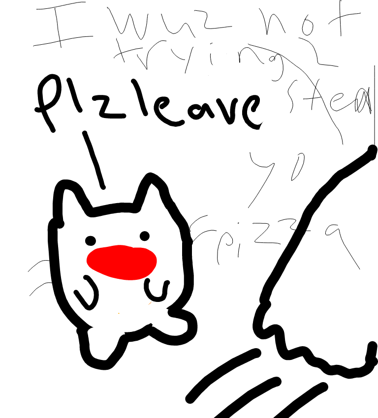 The cat is eating pizza and GHOST trys to steal it. Cat notices and says "Plz leave" and GHOST runs away saying "I WUZ NOT TRTING 2 STEAL YO PIZZA"