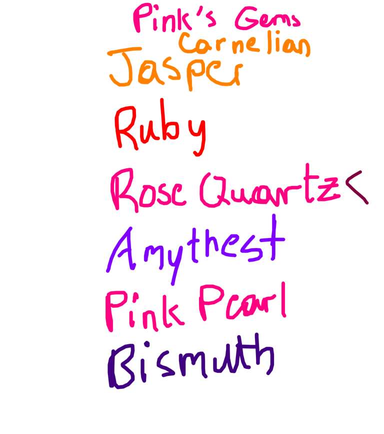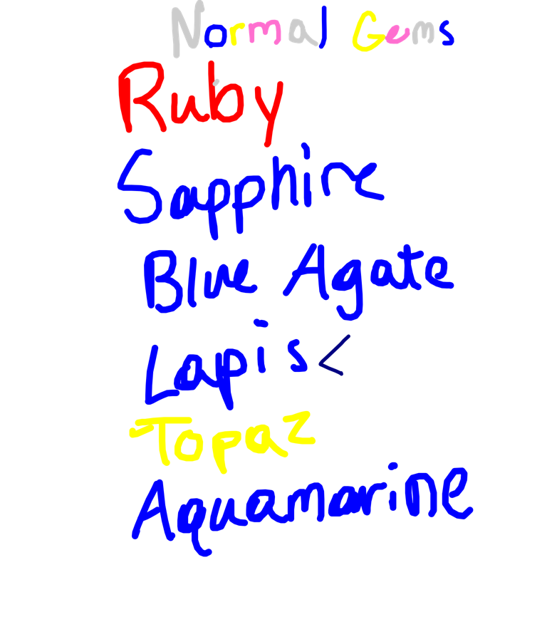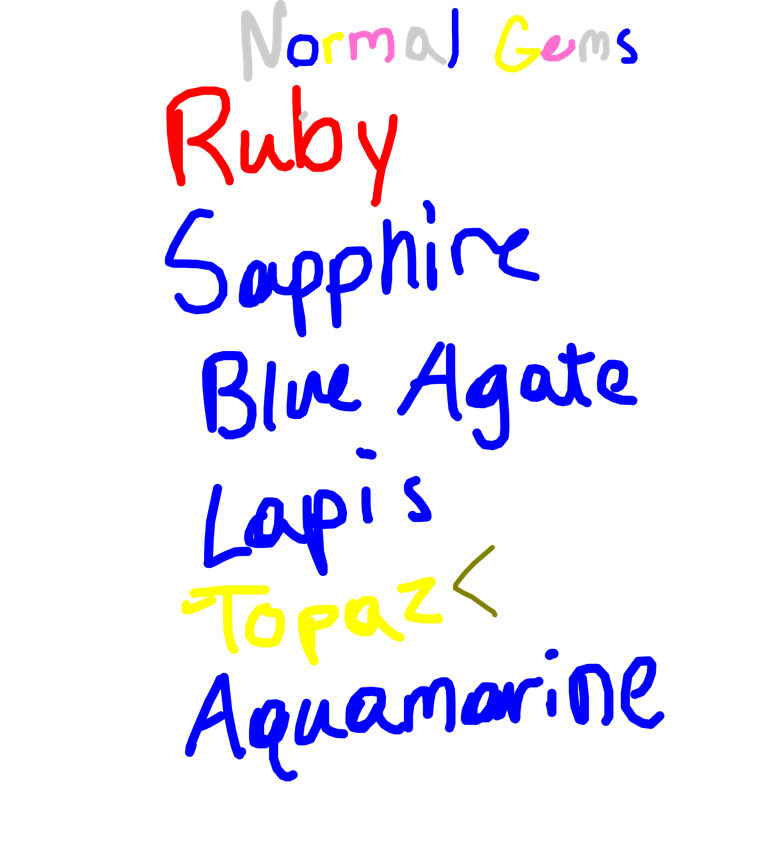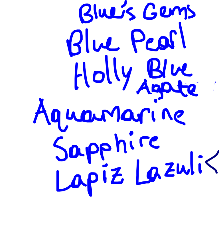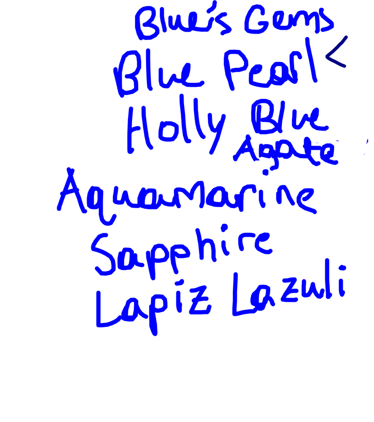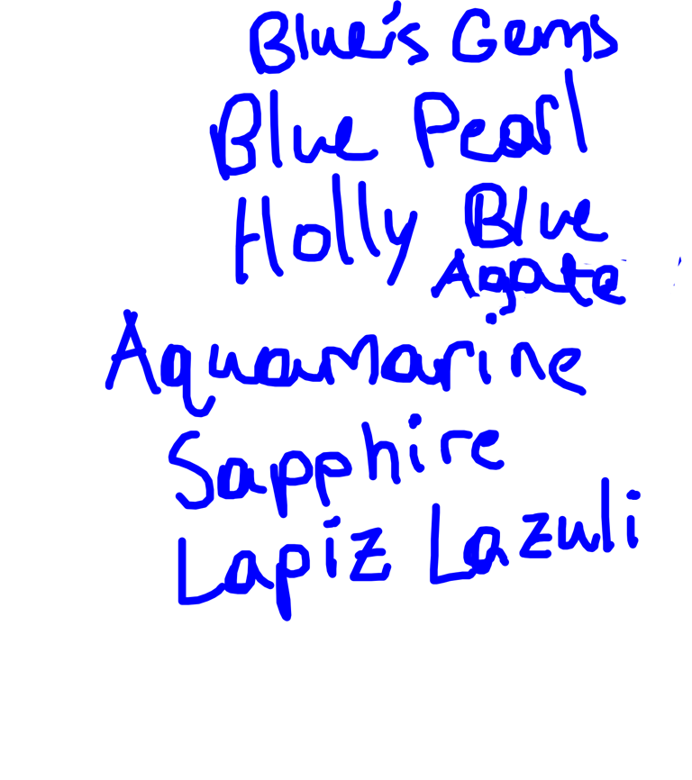 Blue Pearl, Aquamarine, Lapis Lazuli, Blue Zircon, Sapphire, Holly Blue Agate, Yellow Pearl, Topaz, Peridot, Rose Quartz, Jasper, Amethyst, Carnelian, and Pink Pearl