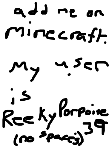 If you couldn’t read it, it’s says, “Add me on Minecraft. My user is ReekyPorpoise39 (no spaces).