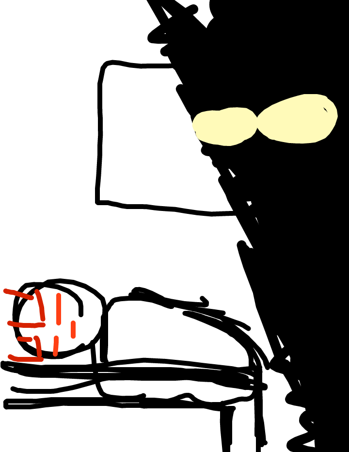 It whas dark and my where gone for a couple of hours it whas thundering so i watched tv but everything changed when the light turned off i whas be like huh the lights did turn on again but there whas a smilling man looking at me for a second and he disapaired a hour later i whas in bed animating ghost eye how he should look like and at that moment i saw him again but with a knife this time he atacked me i dodged he let the knife fall i picked it up and try to atack him my parent just came home and when the opend the door they saw nothing but me with a knife trying to kill a inocent human