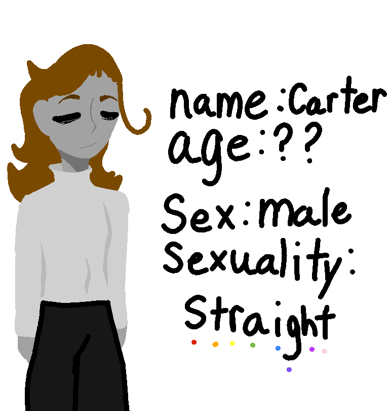 An oc! So if u cant read my handwriting then.... Name: Carter Age: ??? Sex: male Sexuality: straight also he is asexual but i didnt have room to put that