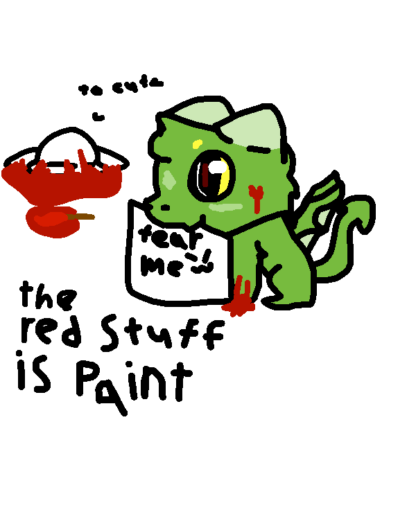 His power is to be so cute then you have a bloody nose, fall, Drago takes the paint brush slides it all over the floor to make it look like you died, then picks up the sign, puts it in his mouth and says, "FEAR MEW"