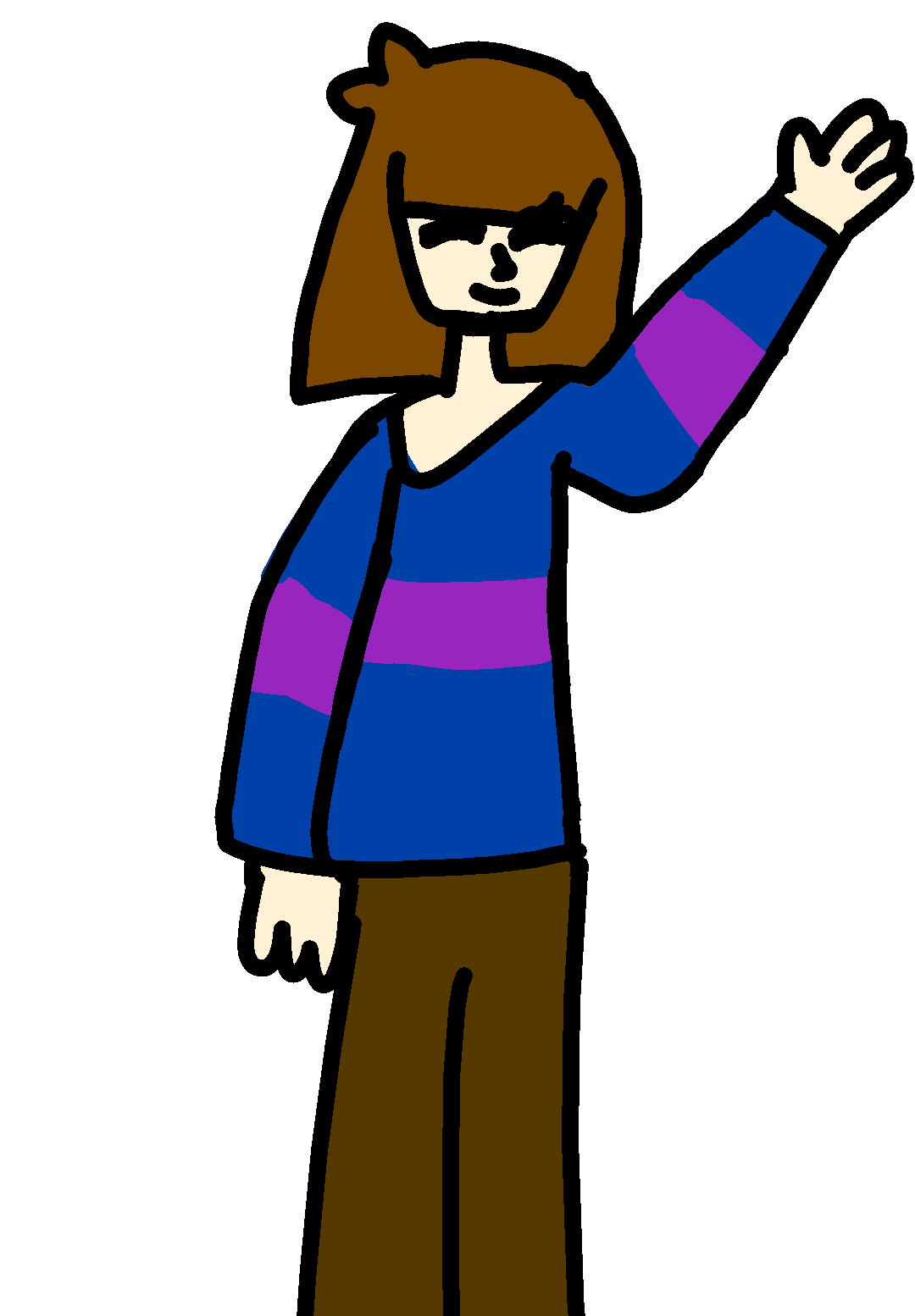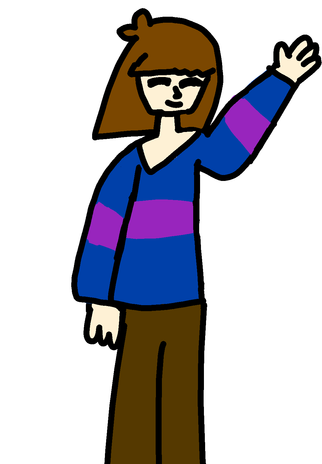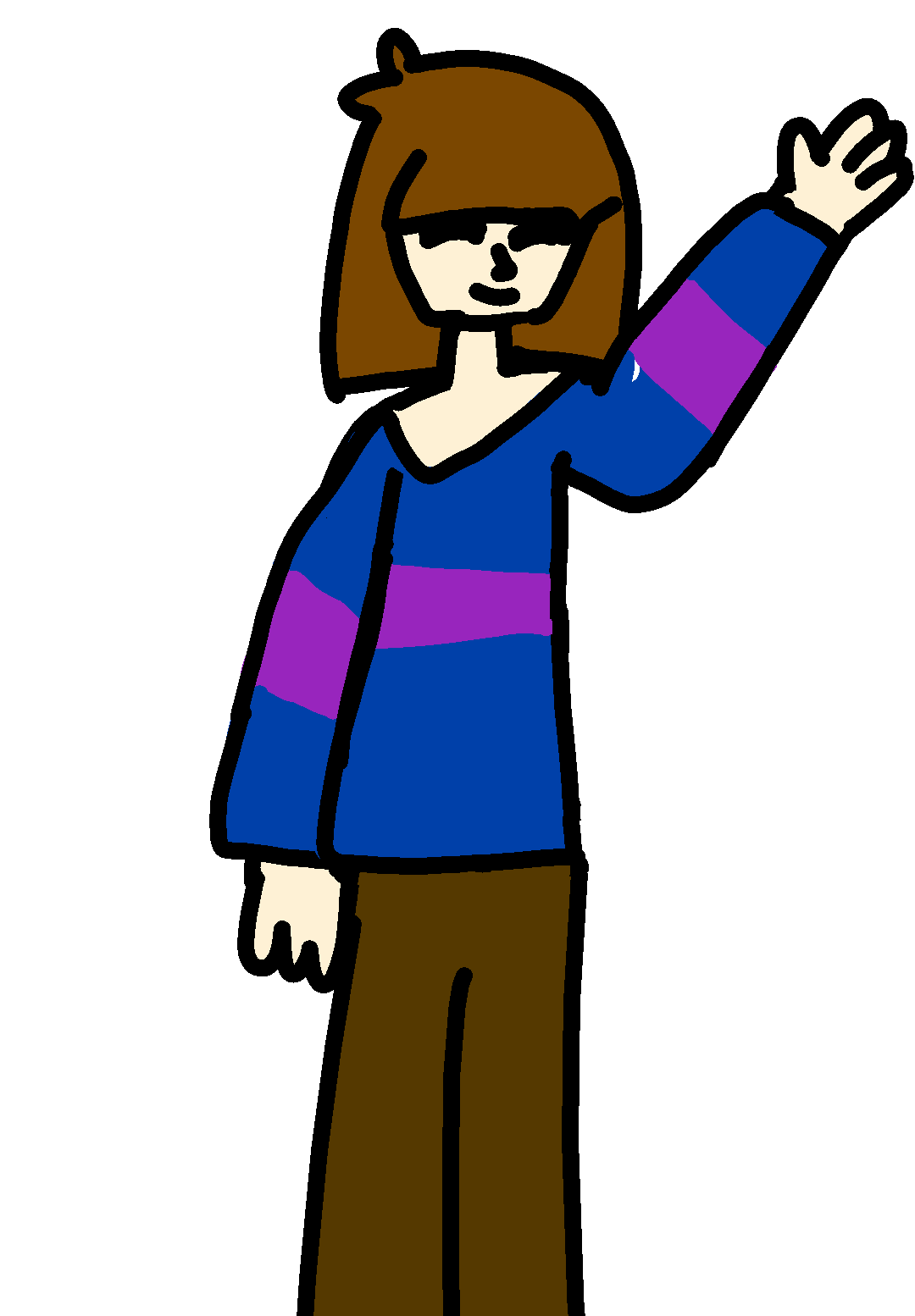 Frisk standing with his\her hand up in a waving sorta fashion while he\she smiles and the wind blows her hair and clothes about
