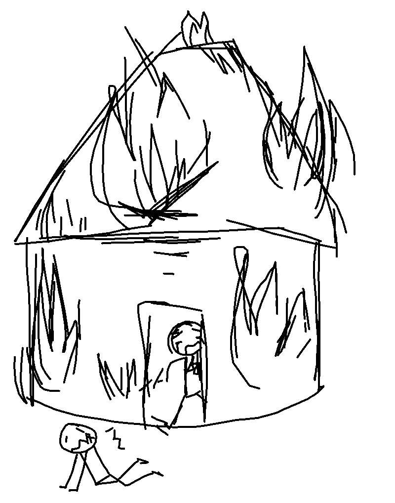 so... he was going to the forest but then when he came back he saw that his house is one fire, he got really sad because his mom has a sickness that she wont able to walk so he thought that is mom died since only his siblings came from the fire, they don't know who made the fore until now :)