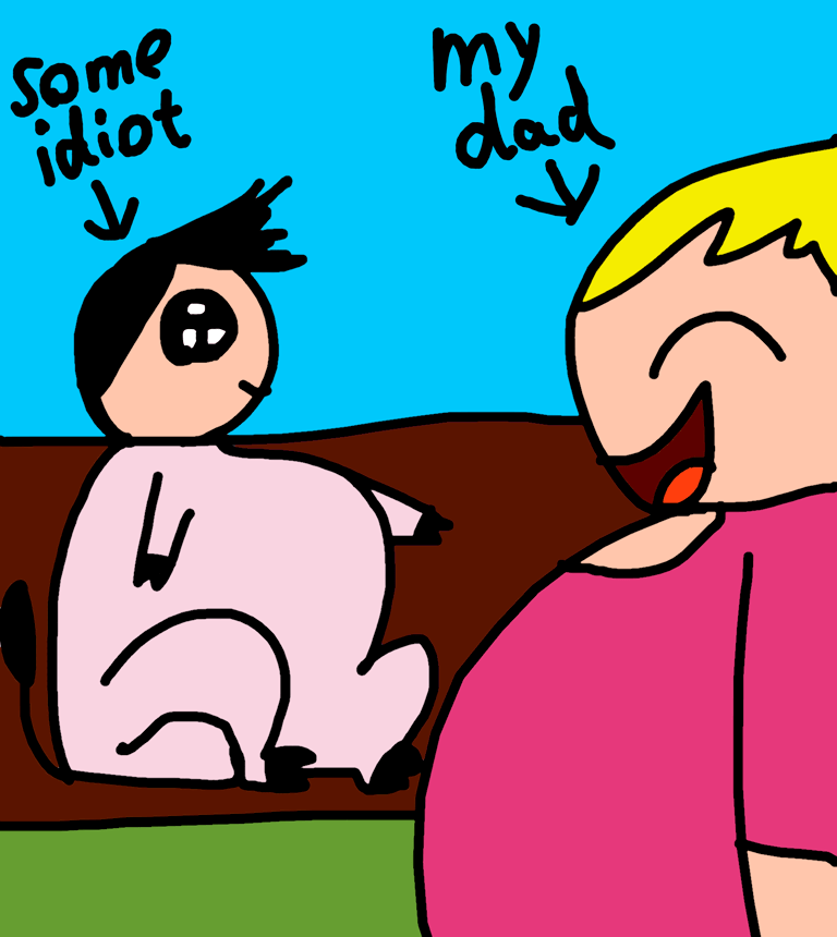 While i was at school he was at the farm and he saw some idiot that tried to annoy him and then while some idiot was at home my dad decided to Draw something funny: a headless pig. He wanted for a idiot to come and then 1 hour later a idiot came outside and sat at the chair and the Drawing was like: a Man that is a pig! Well my dad calls him a idiot