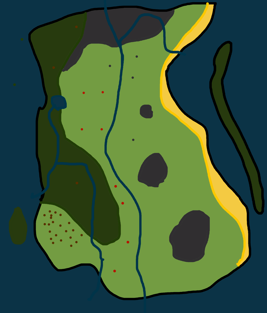 Dark blue rivers and oceans brown little towns dark green Forest yellow beach gray city red farms
