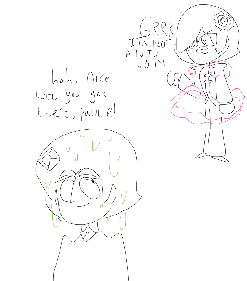Since he’s a flower, rose Paul along with the other flowers thinks it’s trendy to wear frilly clothing. John isn’t trying to be mean, but just trying to have a laugh.