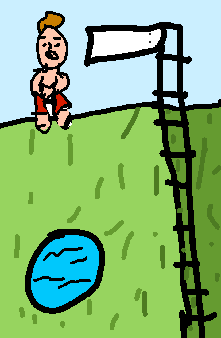 A guy jumping off a big diving board into a tiny pool