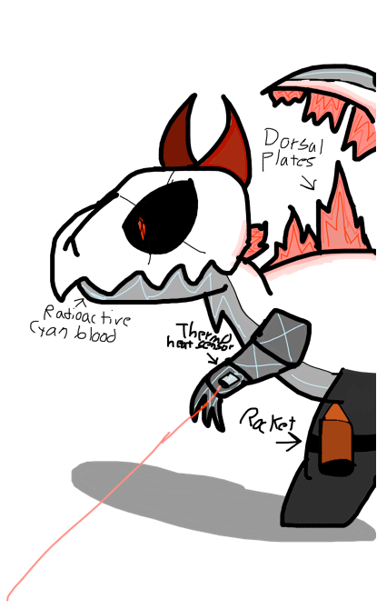 So anyways, this is a half robot half Raptor. This Type of raptor has an atomic beam, rocket jump, and Thermo heat sensors. The atomic beam is activated then the Dorsal Plates glow when he opens its mouth it will unleash a red beam which if hits you will leave 3rd degree burns as well as death if your not well protected. The rocket jump is activated when it jumps in the air making it able to fly and also attack at the same time. The thermo Heat sensors will find any predator hiding due to the heat they are producing from their body, however, it can easily confuse prey with fire, so it will stare at the fire until it turns into ashes then it will resume to attack its prey. Its Passive: Radioactive Cyan Blood, when you bite this raptor it will place acid into your mouth dissolving your vocal cords, you can scream in pain but nobody will hear you. However, as scary as it is its quite friendly! If you dont attack it you may be able to befriend it. However you need to feed it mechanic bones, which are obtained from the robot store.