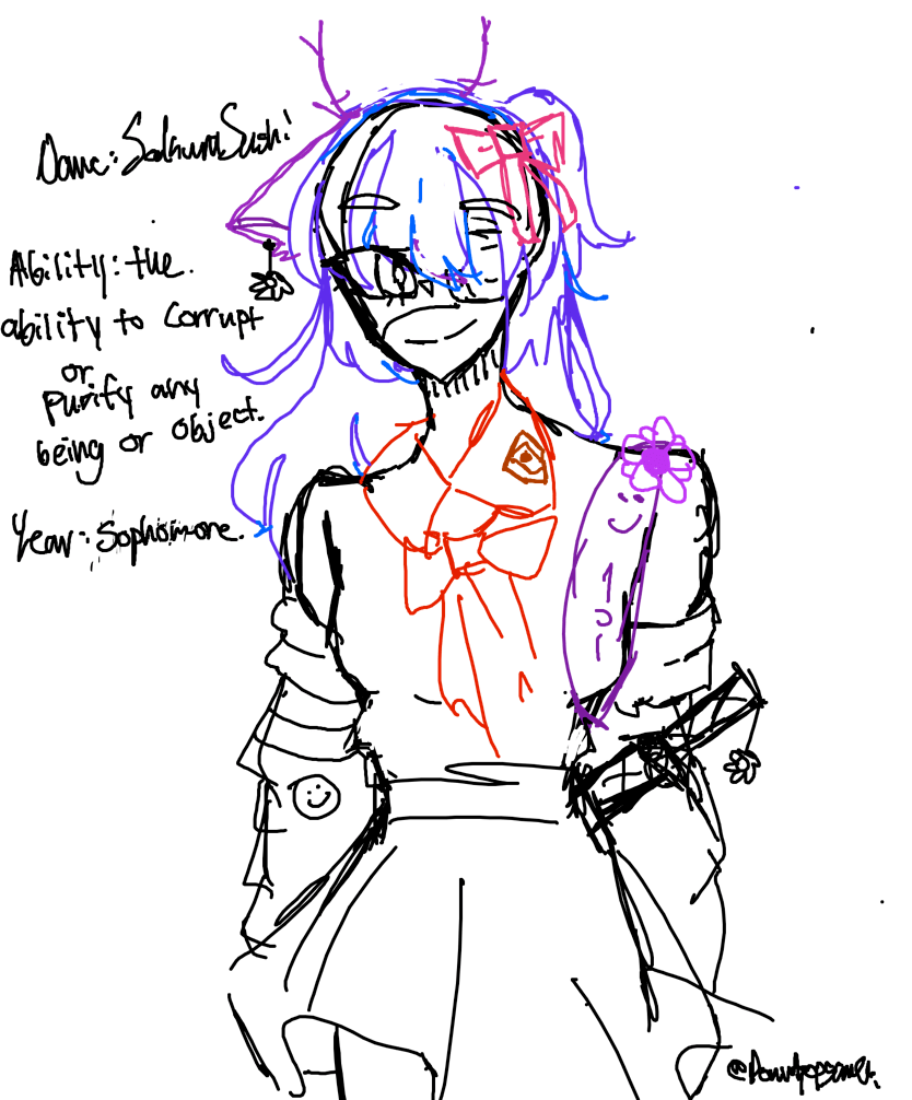 Ability: Able to corrupt of purify any being or object (she doesn’t use that skill as much she uses her blade) she can also manipulate and control minds, and she’s a mind reader. She leans towards being normal most of the time:D