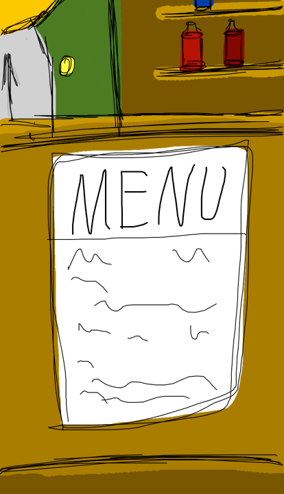 Your stomach growls and you realize you haven’t eaten anything in 24 hours, so you decide to enter the nearest cafe, you sit down and take a look at the menu, you have 10 gold pieces to your name (or 100 silver)